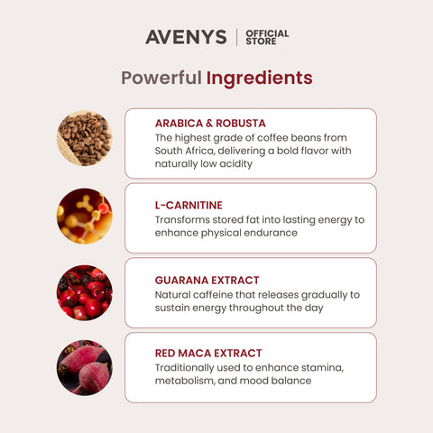 Non-Dairy Creamer, Coffee Powder, Sugar, Maltodextrin, L-Carnitine, Guarana Extract, Red Maca Extract, Flavouring, Stabilizer, Sweetener